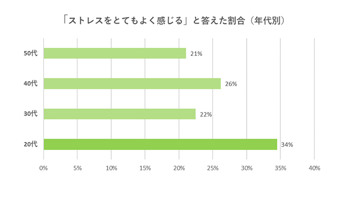 年代別でみると、「ストレスをとてもよく感じる割合」が特に高かかったのは20代でした。
